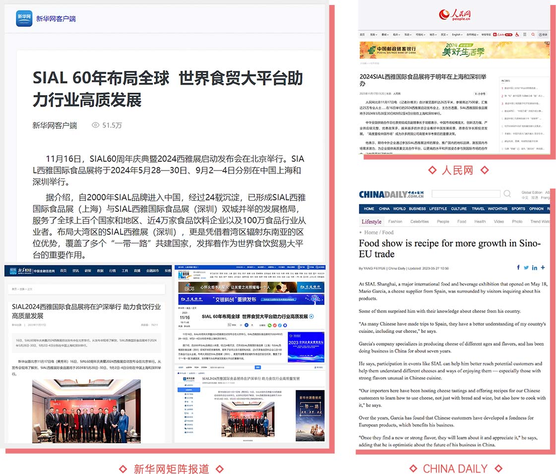 SIAL西雅展憑借著自身的國際化基因以及對(duì)于食飲貿(mào)易的促進(jìn)效果,持續(xù)受到600+各方媒體的關(guān)注和報(bào)道,包括新華社、人民日?qǐng)?bào)、中國新聞社、CHINA DAILY等權(quán)威媒體和浙江衛(wèi)視、深圳衛(wèi)視、山東電視臺(tái)、浦東電視臺(tái)、上海廣播電視臺(tái)外語頻道等多家電視媒體。這些媒體在展會(huì)現(xiàn)場(chǎng)為品牌展商提供多元且權(quán)威的報(bào)道,助力展商品牌曝光、產(chǎn)品流通。