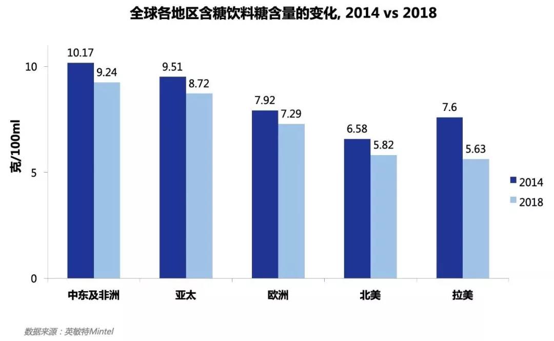 到2020年,為產品減糖仍將是飲料制造商面臨的首要任務。據英敏特數據,全球各地區(qū)含糖飲料糖含量都有不同程度的降低(2014-2018年),特別在亞太地區(qū),糖含量降低了8.3%。