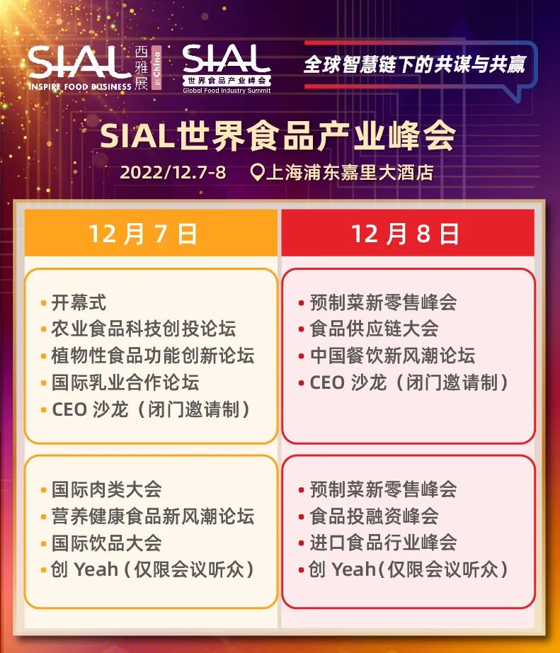 SIAL世界食品產(chǎn)業(yè)峰會(huì)將于2022年12月7日-8日如期舉辦!峰會(huì)將以“全球智慧鏈下的共謀與共贏”為主題舉辦包含預(yù)制菜、新零售、供應(yīng)鏈、農(nóng)業(yè)食品科技、食品投融資、營(yíng)養(yǎng)健康食品、植物性食品、乳業(yè)、肉類、飲品、中餐、進(jìn)口食品在內(nèi)的多場(chǎng)主題論壇。