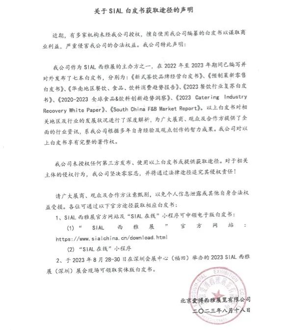 2、于2023年8月28-30日在深圳會(huì)展中心(福田)舉辦的2023 SIAL西雅展(深圳)展會(huì)現(xiàn)場(chǎng)可領(lǐng)取實(shí)體版白皮書(shū)。